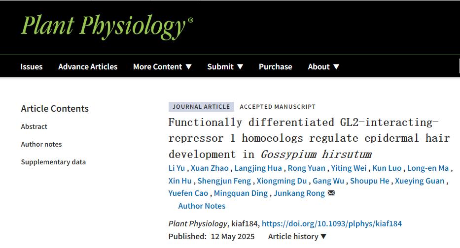近日,浙江农林大学戎均康教授团队在国际知名期刊Plant Physiology(5年IF=7.6)在线发表了“Functionally differentiated GL2-interacting-repressor 1 homoeologs regulate epidermal hair development of Gossypium hirsutum”的科研论文,在棉花表皮毛发育调控机制研究方面取得重要进展。团队研究发现了茎杆表皮毛“开关”基因GhGIR1D,明确了陆地棉A亚组与D亚组GhGIR1基因在调控茎杆茸毛和棉花种子短绒的功能分化。前期研...