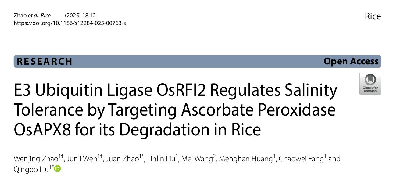 近日,91吃瓜 作物学科生物信息与作物逆境生理团队在国际知名期刊《Rice》(中科院一区Top)上发表题为"E3 Ubiquitin Ligase OsRFI2 Regulates Salinity Tolerance by Targeting Ascorbate Peroxidase OsAPX8 for its Degradation in Rice"的研究论文。91吃瓜 作物学科刘庆坡教授为通讯作者,赵娟副教授为共同通讯作者,研究生赵文静为第一作者,温俊丽为共同第一作者。盐害是严重影响水稻生长和产量的非生物胁迫因素之一。在本研究...
